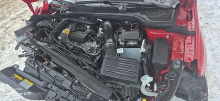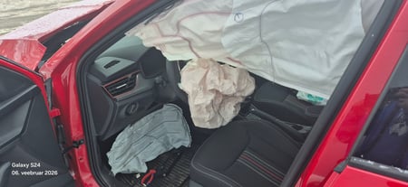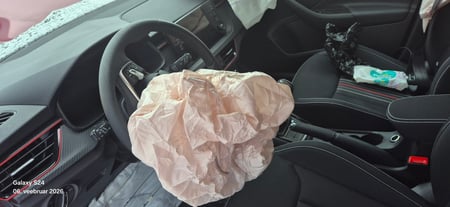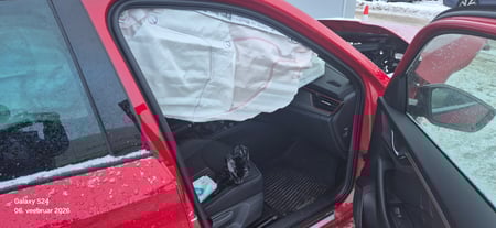 Variklis neveikia, saugos diržai užstrigę, oro pagalvės išsiskleidusios.