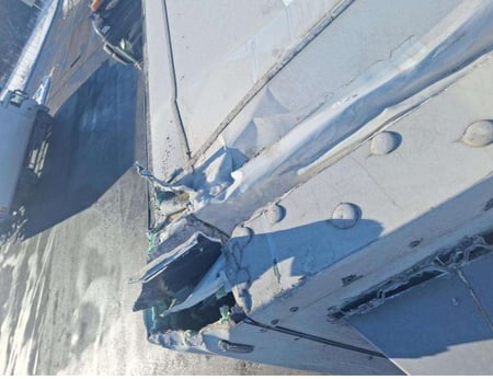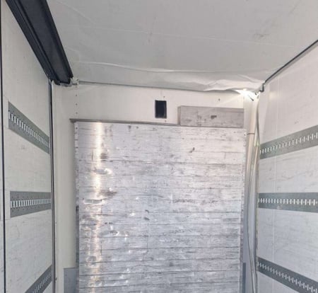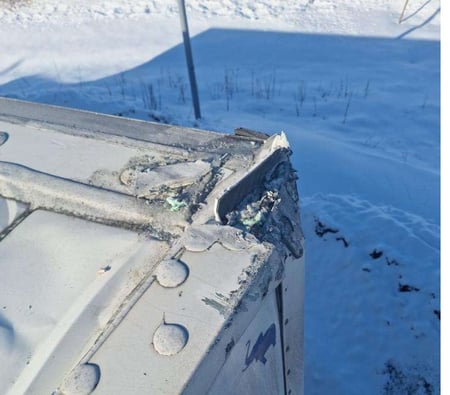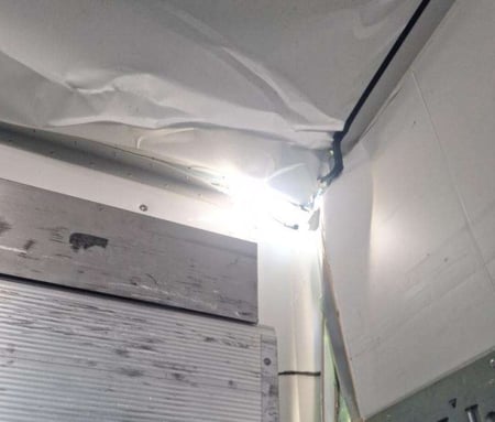 Važiuojant po tiltu apgadintas puspriekabės stogas, priekinė siena.